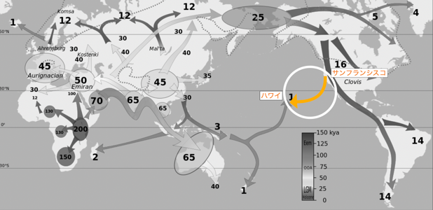 アフリカからユーラシア、そしてアメリカ大陸へと海岸沿いに拡散した古代海洋民族の移動の流れがあることがわかっています。しかし、アメリカ大陸から太平洋の島々への航路は認められていない点に違和感を覚えました。
