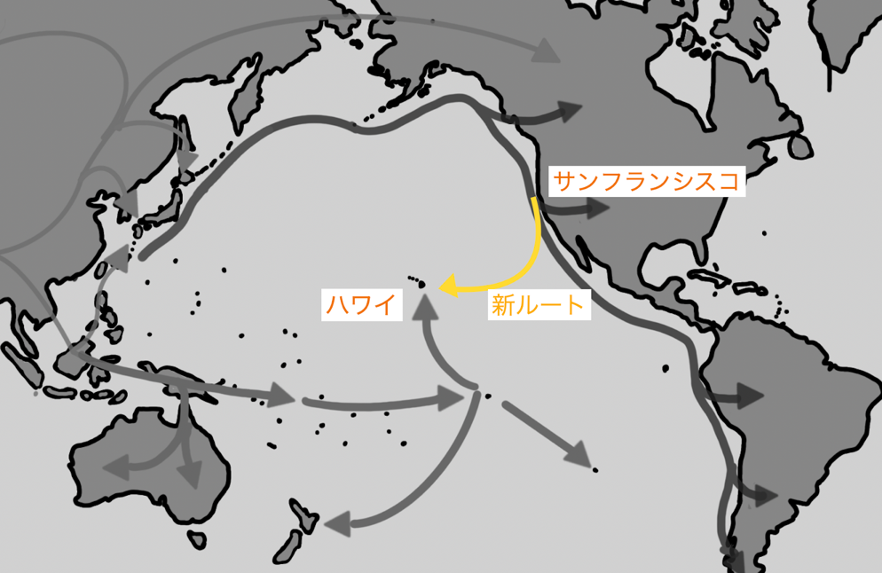 サンフランシスコ湾沖からハワイやミクロネシアに向かう風と海流は、漂流物でも届くような航海に利用できる自然の流れが存在しています。
